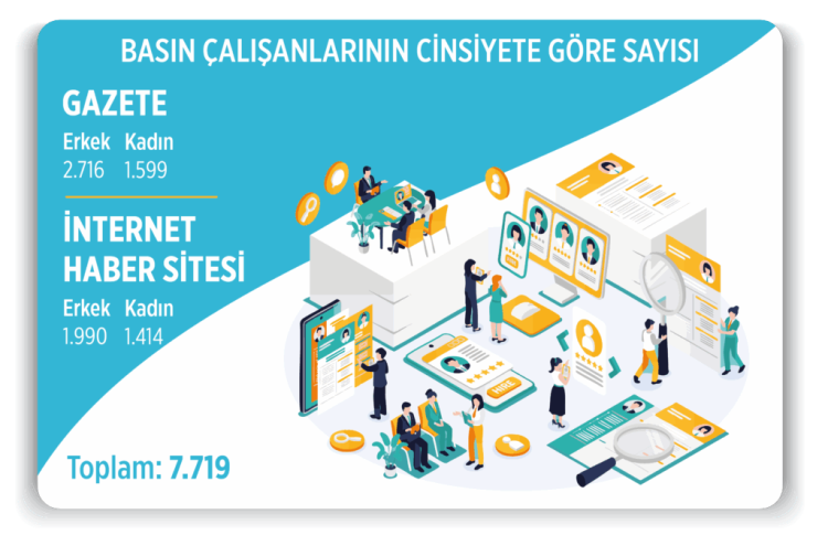 Gazete ve internet haber sitelerinde çalışan 7.719 basın çalışanının 3.013’ünü kadınlar oluşturdu. Gazetelerde 1.599’u kadın ve 2.716’sı da erkek olmak üzere toplam 4.315, internet haber sitelerinde ise 1.414’ü kadın 1.990’ı da erkek olmak üzere toplam 3.404 basın çalışanı istihdam edildi.