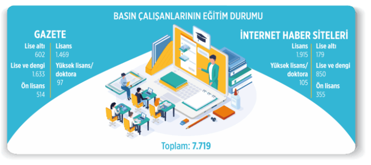 Basın çalışanlarının eğitim düzeyleri incelendiğinde ise yüzde 43,8 oranıyla büyük çoğunluğunun lisans seviyesinde eğitim gördüğü istatistiklere yansıdı. Bunu, yüzde 32,2 ile lise, yüzde 11,3 ile ön lisans, yüzde 10,1 ile lise altı, yüzde 2,6 ile de yüksek lisans ve doktora mezunu gazeteciler izledi.