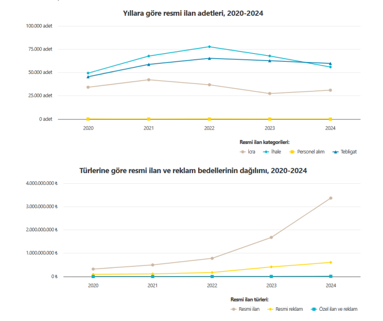 2024 yılında yayımlanan resmî ilan ve reklamların bedeli 2023 yılına göre yüzde 90 oranında artarak toplam 3.985.113.210 Türk Lirası olarak gerçekleşti. Buna karşın 2023 yılında yayımlanan 158.221 adet ilan, yüzde 7,1 azalarak 2024 yılında 146.944 sayısına geriledi.