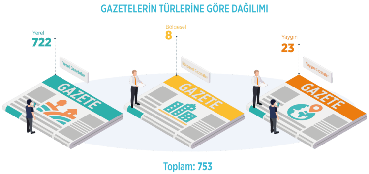 753 gazetenin yüzde 95,9’i yerel, yüzde 3’ü yaygın, yüzde 1,1’i ise bölgesel yayınlardan oluştu. Gazetelerin yayımlanma sıklığına bakıldığında ise 456’sının günlük, 297’sinin ise haftada 2 ila 6 gün arasında değişen periyotlarla yayımlandığı istatistiklere yansıdı.