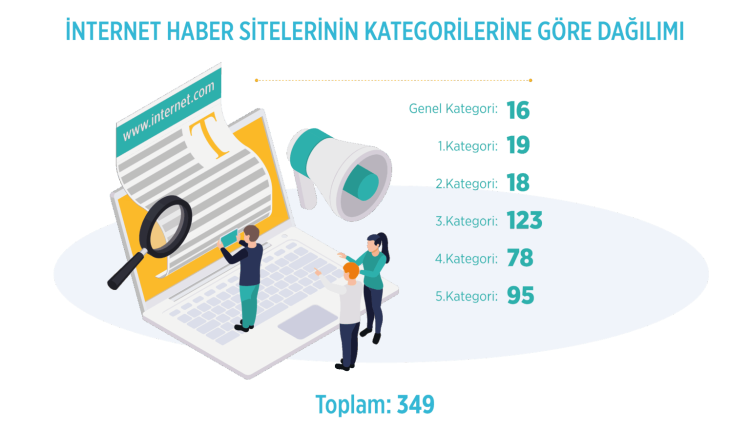 349 İnternet haber sitesinin yüzde 4,6’sı Genel Kategori, yüzde 5,4’ü 1. Kategori, yüzde 5,2’si 2. Kategori, yüzde 35,2’si 3. Kategori, yüzde 22,4’ü 4. Kategori, yüzde 27,2’si de 5. Kategori’de yer aldı.