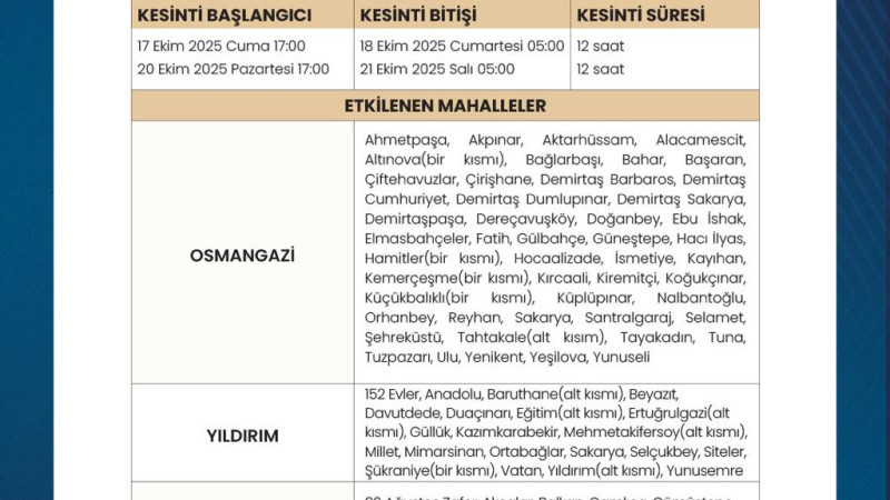 Bursa'da bir süredir ilçelerin merkez mahallelerinde haftada aralıklarla 3 gün olarak 12 saat süreli su kesintileri 22 Ekim tarihine kadar devam edecek.