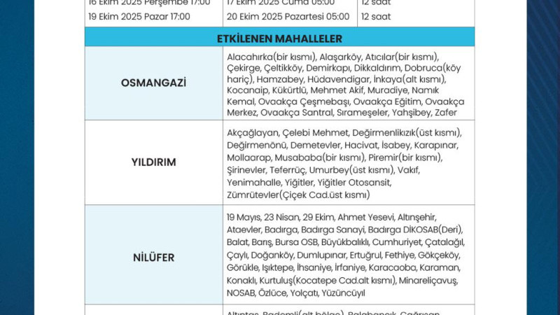 Söz konusu planlı su kesintileri, günlük 12 saati geçmemek kaydıyla, merkez ilçelere bağlı mahallelerde dönüşümlü olarak uygulanacaktır. Yapılması planlanan su kesintileri ile günlük 100 bin metreküp su tasarrufu yapılması hedeflenmektedir. Planlı su kesintilerinden Uludağ Üniversitesi, Şehir Hastanesi ve Devlet Hastaneleri etkilenmeyecektir.