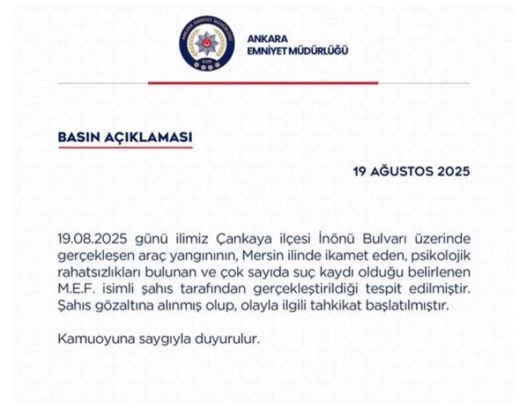 Emniyetten yapılan açıklamada aracı yakan kişinin psikolojik rahatsızlıklarının olduğu belirtildi.