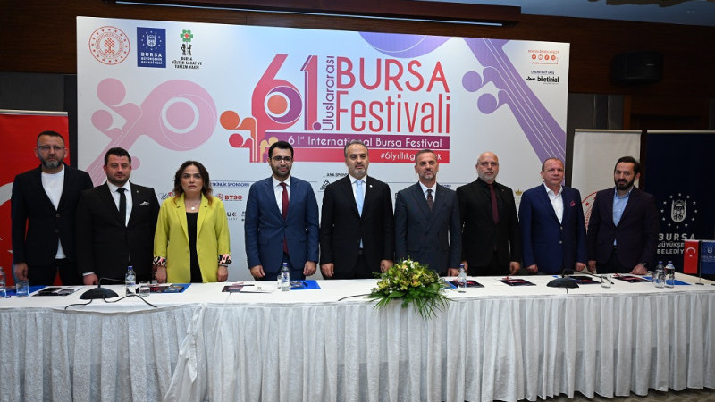 Bursa Büyükşehir Belediyesi adına Bursa Kültür Sanat ve Turizm Vakfı (BKSTV) tarafından düzenlenen, Kültür ve Turizm Bakanlığı tarafından da desteklenen 61’inci ‘Uluslararası Bursa Festivali’nin tanıtım toplantısı, Hilton Otel’de yapıldı. Festivalin tanıtım toplantısına Bursa Büyükşehir Belediye Başkanı Alinur Aktaş, BKSTV Başkanı Sadi Etkeser, BKSTV Yönetim Kurulu, sponsor firmaların temsilcileri ve basın mensupları katıldı.