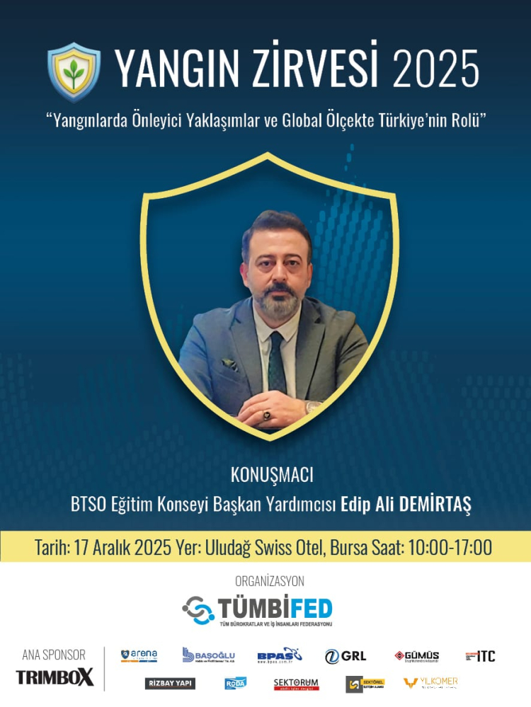 Yangın Zirvesi’nin Düzenleme Kurulu Başkanı ve BTSO Eğitim Konseyi Başkan Yardımcısı Edip Ali Demirtaş da, bu sene geniş katılımlı olarak düzenlenecek uluslararası organizasyon niteliğindeki Yangın Zirvesi’nin ana temasının “Birlikte önleyebiliriz” olduğunu söyledi. Etkinliğin ülkemizde ve dünyada yangın güvenliği farkındalığını artıracağını vurgulayan Demirtaş ”Zirvenin hedefleri arasında; elektrik yangınlarını başlamadan engelleyen standartların oluşturulması, SPD ve SSD’nin görev tanımlarının yönetmeliklerde netleşmesi, nötr–toprak regülasyonunun ulusal güvenlik standardı hâline gelmesi, uluslararası standartların artırılarak Türkiye’den önleyici nitelikte belirlenmesi, kamu–özel–akademi iş birliğinin güçlendirilmesi yer alıyor. Zirvenin bitiminde bir sonuç bildirgesi yayınlayacağız, aynı zamanda yapay zeka ile 5 dilde hazırlanmış olan 5K formatındaki belgeselimizi de farkındalık oluşması için üniversitelerimiz başta olmak üzere eğitim alanındaki kamu ve özel kurumlarımızda izlenime açacağız” dedi.