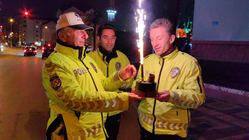 Uygulama yapan polis ekiplerine pastalı sürpriz