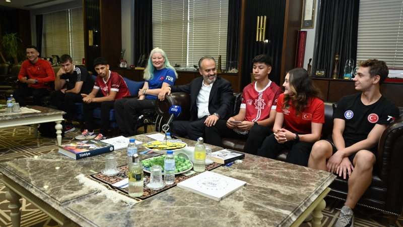 Bünyesindeki 24 branş ve binlerce sporcuyla Bursa’nın sporda önemli bir lokomotifi olan Büyükşehir Belediyespor’un milli formayla derece elde eden sporcuları Başkan Alinur Aktaş’ı ziyaret etti. Büyükşehir Belediyespor Kulüp Başkanı Gökhan Dinçer ve kulüp antrenörlerinin de hazır bulunduğu ziyarete, uluslararası müsabakalarda madalya kazanan sporcular, Para-Atıcılık Dünya Şampiyonu Aysel Özgan, Modern Pentlanton U17 Avrupa Üçüncüsü Eda Özrodop, Bocce Dünya İkincisi Hüseyin Önder ve Dünya Altıncısı Emirhan Şahiner, İsviçre Açık Avrupa Karate Şampiyonası +84Kg ikincisi Umut Eren Gündoğ, Büyükler Karate Balkan üçüncüsü Emir Buğra Gencan ve 16 yaş 400m serbest şampiyona rekortmeni Özgür Yonca katıldı. Sporcularla sohbet eden ve yarışlar hakkında bilgi toplayan Başkan Aktaş, Büyükşehir Belediyespor’un Bursa’da yaşayan herkesi sporla buluşturmayı hedeflediğini söyledi. Derece elde eden sporcuları tebrik eden Alinur Aktaş, “Milli formayı terleterek şehrimizin ismini duyuran tüm sporcu kardeşlerime teşekkür ediyorum. Büyükşehir Belediyespor’un amacı bütün şehri sporla buluşturmak ama içlerinde yetenekli olanları tespit ederek onları daha ileri düzeye getirerek milli formayı giymelerini sağlamak. Yaz ve Kış Spor Okulları’yla binlerce evladımızı ağırlıyoruz, önemli bir altyapı çalışmamız var. Kulüp başkanımız, yöneticilerimiz başta olmak üzere kulüp idarecilerimize, sporcularımıza emek veren kıymetli antrenörlerimize, kıymetli ailelerimize ve sporcu kardeşlerime çok teşekkür ediyorum. İnşallah sporcularımızı daha güzel başarılarıyla ağırlayalım, daha güzel başarılar duyalım, şahit olalım istiyoruz’ diye konuştu. Program sonunda Başkan Alinur Aktaş sporculara altın ve çeşitli hediyeler verirken, Kulüp Başkanı Gökhan Dinçer ise, Türkiye Atletizm Federasyonu Fatih Çintimar tarafından gönderilen milli takım eşofmanını Başkan Aktaş’a teslim etti.