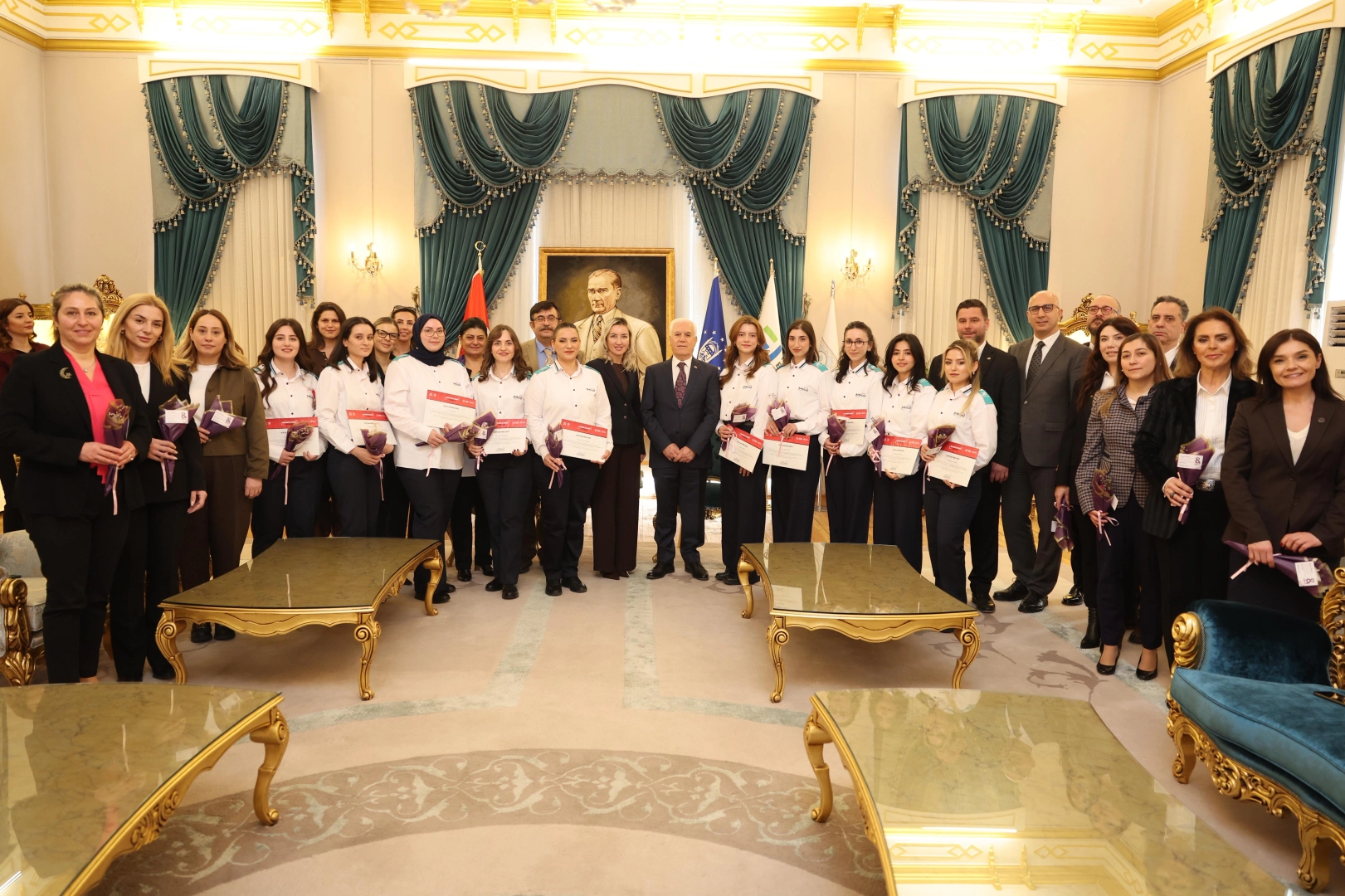 ‘Eğitim Destekli İstihdam Projesi’ kapsamında düzenlenen ‘tramvay/metro sürücülüğü eğitimlerini başarıyla tamamlayan 10 kadına, Bursa Büyükşehir Belediye Başkanı Mustafa Bozbey tarafından belgeleri verildi.