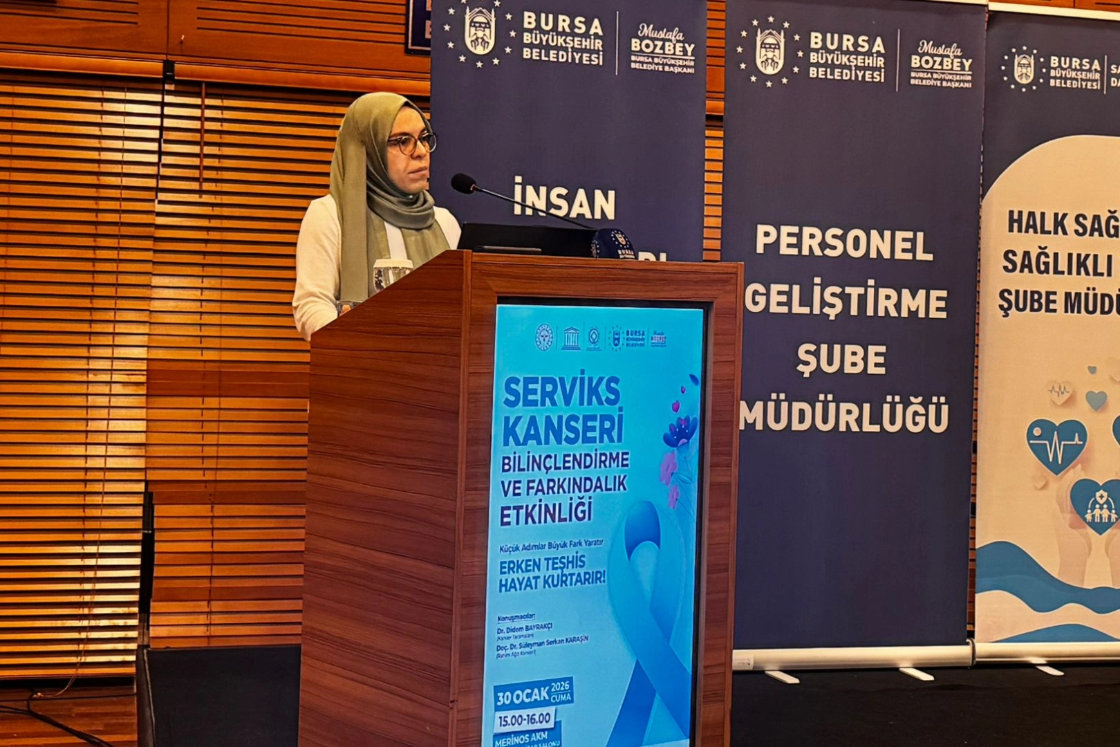 Ocak ayının Serviks Kanseri Farkındalık Ayı olarak kabul edilmesi kapsamında, Bursa Büyükşehir Belediyesi tarafından kadın çalışanlara yönelik ‘Serviks Kanseri Bilinçlendirme ve Farkındalık Etkinliği’ düzenlendi. İnsan Kaynakları ve Eğitim Dairesi Başkanlığı ile Sağlık İşleri Dairesi Başkanlığı iş birliğinde, İl Sağlık Müdürlüğü’nün desteğiyle gerçekleştirilen program, Atatürk Kültür Merkezi Merinos Yerleşkesi’nde yapıldı.