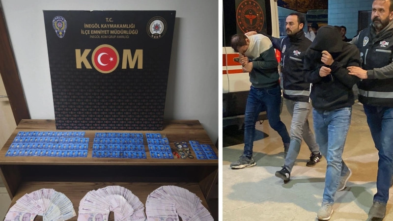 Dolandırıcılık olayı İnegöl ilçesi kuyumcular çarşısında faaliyet gösteren bir kuyumcuda meydana geldi. 2 şüpheli girdikleri kuyumcuya 2 tane gerçek altını bozdurmak için gösterdiler. Altınların gerçek olduğunu gören tespit eden kuyumcu altınları aldı. Şüpheliler, saniyeler sonra sahte olan 40 adet gram altını da kuyumcuya sattılar. Bozdurdukları altınlardan elde ettikleri yaklaşık 200 bin TL'yi alan şüpheliler işyerinden çıkarak hızla uzaklaştılar. Bir süre sonra aldığı altınları tek tek inceleyen kuyumcu, altınların sahte olduğunu görünce polise haber verdi. Bursa İl Emniyet Müdürlüğü Kaçakçılık ve Organize Suçlarla Mücadele Büro Amirliği ekipleri, harekete geçti. Kamera görüntülerinden şahısları tespit eden KOM ekipleri, şüphelileri Bursa da yakaladı. Şüpheliler H.İ.K(37) ve E.S.(25) Bursa İl Merkezinde yakalanıp gözaltına alındılar. Şüpheli şahısların Bursa'nın İnegöl, Bilecik'in Bozüyük, Kütahya'nın Emet ve Tavşanlı ilçelerinde 4 müştekiye her biri 1'er gramlık toplamda 129 adet sahte altın vererek dolandırdıkları tespit edildi. Şahısların aracında yapılan aramada 76 adet 1'er gramlık sahte altın, 10 adet 1'er gramlık gerçek altın, 7 adet gerçek Cumhuriyet altını, 143 bin lira nakit ele geçirildi. Şüpheliler H.İ.K. ve E.S., ifadelerinin ardından İnegöl Adliyesine sevk edildiler.
