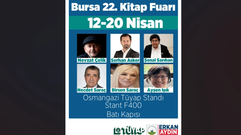 Osmangazi Belediyesi’nin standında kitapseverlerle buluşacak olan yazar ve şairlerin söyleşi ve imza programları belli oldu. 12 Nisan Cumartesi saat 13.00 Nevzat Çelik, 13 Nisan Pazar saat 15.00 Serhan Asker, 14 Nisan Pazartesi saat 17.00 Ayşen Işık, 16 Nisan Çarşamba saat 14.00 Şenal Sarıhan, 18 Nisan Cuma saat 15.00’ta ise Necdet Saraç ve Birsen Saraç, sevenleriyle Osmangazi Belediyesi’nin standında bir arada olacak.