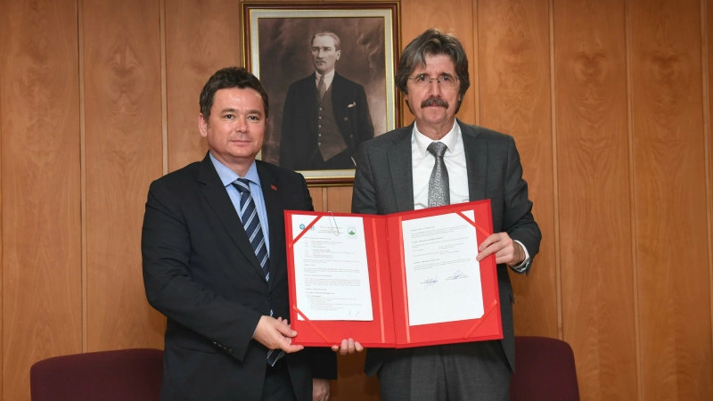 Bursa Uludağ Üniversitesi Rektörlük Binası’nda imzalanan protokolün ardından Osmangazi Belediye Başkanı Erkan Aydın ve Bursa Uludağ Üniversitesi Rektörü Prof. Dr. Ferudun Yılmaz, günün anısına birbirine hediye takdim etti.