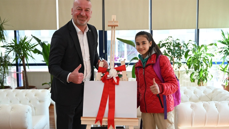 Karacabey Şehit Serkan Şahin Ortaokulu 7. sınıf öğrencisi Hazal Emergen, 23 Nisan Ulusal Egemenlik ve Çocuk Bayramı kapsamında düzenlenen resim yarışmasında ilçe birincisi olarak önemli bir başarıya imza attı. Hazal’ın ödüllü eseri, şimdi Bursa finallerinde Karacabey’i temsil edecek. Başarılı öğrenciyi makamında ağırlayan Belediye Başkanı Fatih Karabatı, Hazal’a sanatsal çalışmalarında destek olması amacıyla bir resim şövalesi hediye etti ve genç yeteneğin ilerleyen süreçte de büyük başarılara imza atacağına inandığını vurguladı.