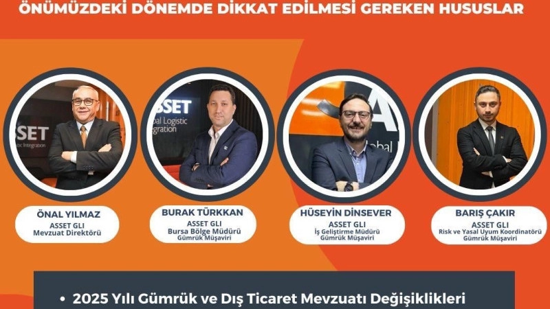 Asset Global Logistic Integration (GLI) ve NOSAB iş birliğiyle düzenlenen etkinlik, 15 Ocak Çarşamba günü, 13.30-16.30 saatleri arasında, NOSAB Yalçın Aras Konferans Salonu'nda gerçekleştirilecek. Konferansta, mevzuat değişikliklerinin yanı sıra yeşil mutabakat ve karbon ayak izi ile tedarik zincirinde maliyet azaltıcı gümrük uygulamaları masaya yatırılacak. Etkinlikte Asset GLI Mevzuat Direktörü Önal Yılmaz, Bursa Bölge Müdürü Burak Türkkan, İş Geliştirme Müdürü Hüseyin Dinsever ile Risk ve Yasal Uyum Koordinatörü Barış Çakır konuşmacı olarak yer alacak. Katılımcılar, güncel mevzuat değişiklikleri hakkında bilgi edinme fırsatı bulurken, dış ticaret ve lojistik süreçlerinde yeni stratejiler geliştirme imkanı yakalayacak.