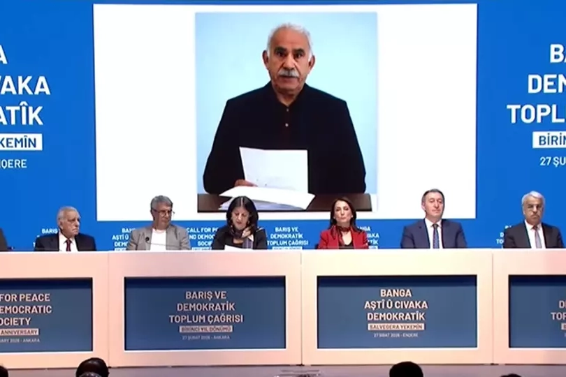 Terörsüz Türkiye süreci kapsamında bugün Ankara'da hareketlilik yaşanıyor. Yılmaz Güney sahnesinde DEM Parti Eş Genel Başkanlar Tülay Hatimoğulları ve Tuncer Bakırhan'ın da katıldığı programda İmralı'dan gelen mesaj okundu. Programın başlarında Öcalan'ın İmralı Cezaevi'nde elinde çağrı metnini tutarken çekilen fotoğrafı paylaşıldı.