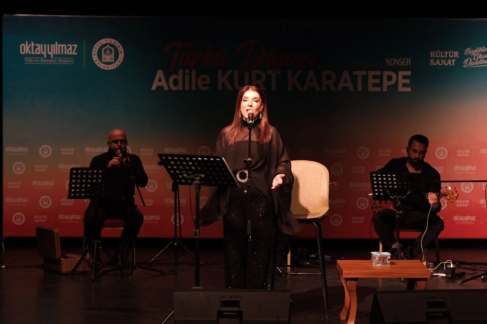 Yıldırım Belediyesi’nin kültür sanat etkinlikleri kapsamında sahne alan Türk halk müziğinin güçlü sesi Adile Kurt Karatepe, “Türkü Diyarı” konserinde Anadolu’nun sevilen ezgileriyle Yıldırımlılara unutulmaz bir akşam yaşattı.