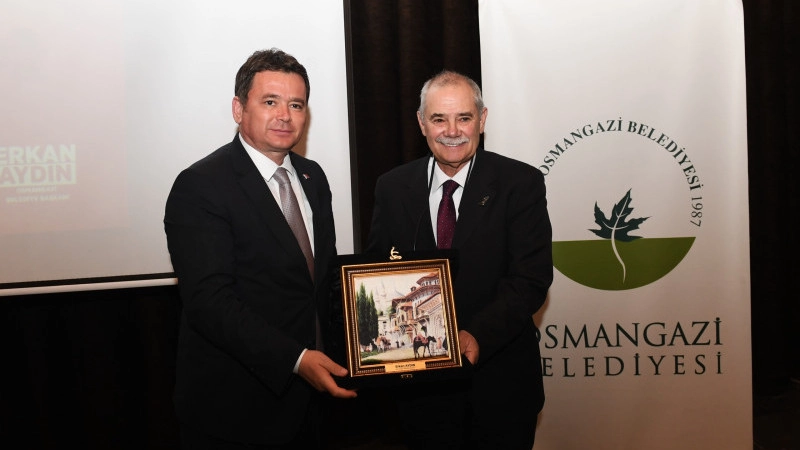 Düzenlenen söyleşinin ardından Osmangazi Belediye Başkanı Erkan Aydın, Cumhuriyet Vakfı Genel Sekreteri Işık Kansu’ya günün anısına hediye takdim etti.
