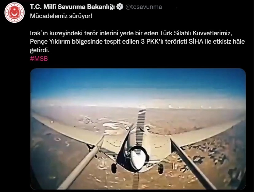 Mili Savunma Bakanlığı sosyal medya hesabından, "Irak'ın kuzeyindeki terör inlerini yerle bir eden Türk Silahlı Kuvvetlerimiz, Pençe Yıldırım bölgesinde tespit edilen 3 PKK'lı teröristi SİHA ile etkisiz hâle getirdi." paylaşımında bulundu.