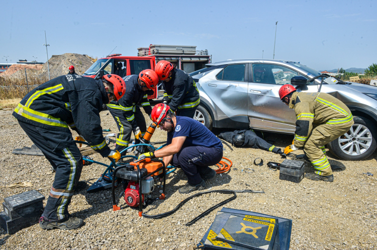 Küçükbalıklı'daki İtfaiye Eğitim Merkezi'nde yangına müdahale, arama kurtarma gibi çeşitli konularda uygulama yapılırken, senaryo gereği trafik kazası sonucu araç içinde sıkışan kazazedenin kurtarılması takibatı da gerçeği aratmadı