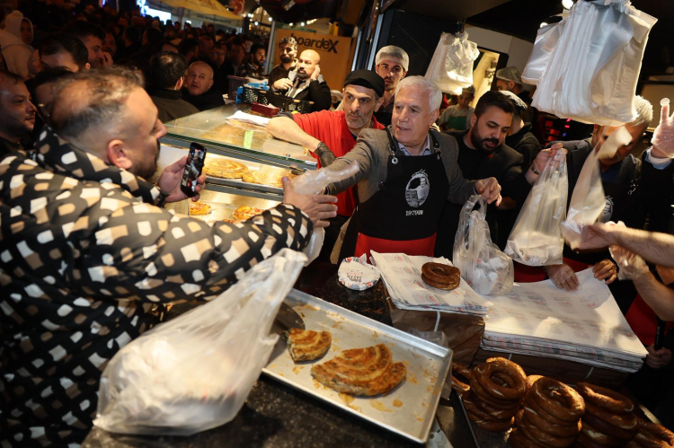 Gençler tarafından meşalelerle karşılanan Başkan Mustafa Bozbey, vatandaşlarla sohbet edip bol bol hatıra fotoğrafı çektirdi. Daha sonra önlüğü giyerek tezgahın başına geçen Başkan Bozbey, meydanı dolduranlara tahanlı pide, börek ve simit ikram etti.