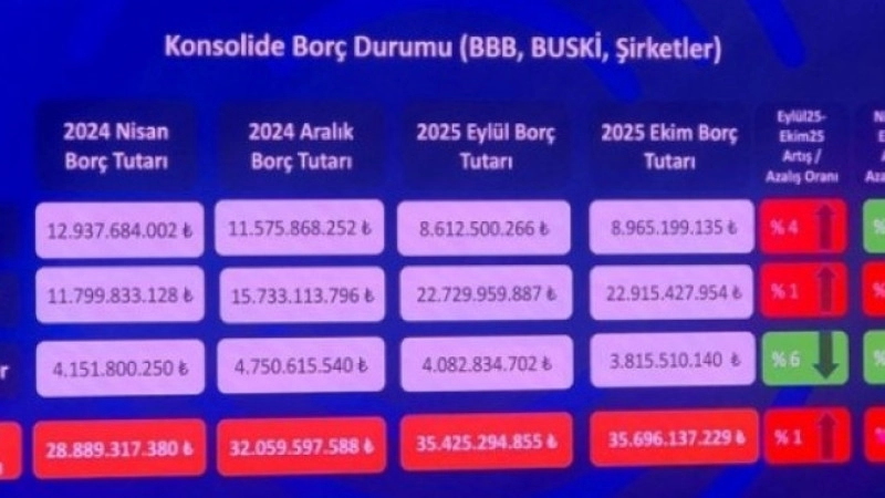 Başkan Bozbey, Eylül ile Ekim ayları arasındaki değişimlere de değinerek, Büyükşehir Belediyesi’nin borcunda yüzde 4’lük artış, BUSKİ’de yüzde 1’lik artış, şirketlerde ise yüzde 6’lık düşüş olduğunu açıkladı. Nisan 2024’ten itibaren ise Büyükşehir’in toplam borcunun 835 milyon Euro’dan 735 milyon Euro’ya gerilediğini belirtti.