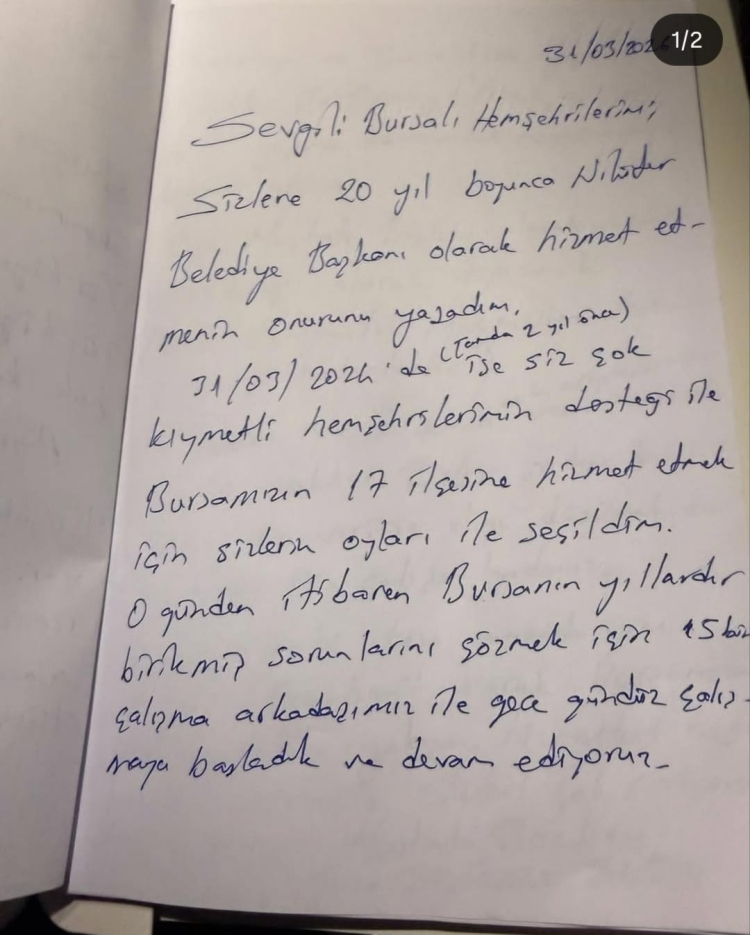 Sizlere 20 yıl boyunca Nilüfer Belediye Başkanı olarak hizmet etmenin onurunu yaşadım. 31/03/2024'te (Tam da iki yıl önce) ise siz çok kıymetli hemşehrilerimin desteği ile Bursamızın 17 ilçesine hizmet etmek için sizlerin oyları ile seçildim. O günden itibaren Bursa'nın yıllardır birikmiş sorunlarını çözmek için 15 bin çalışma arkadaşımız ile gece gündüz çalışmaya başladık ve devam ediyoruz.