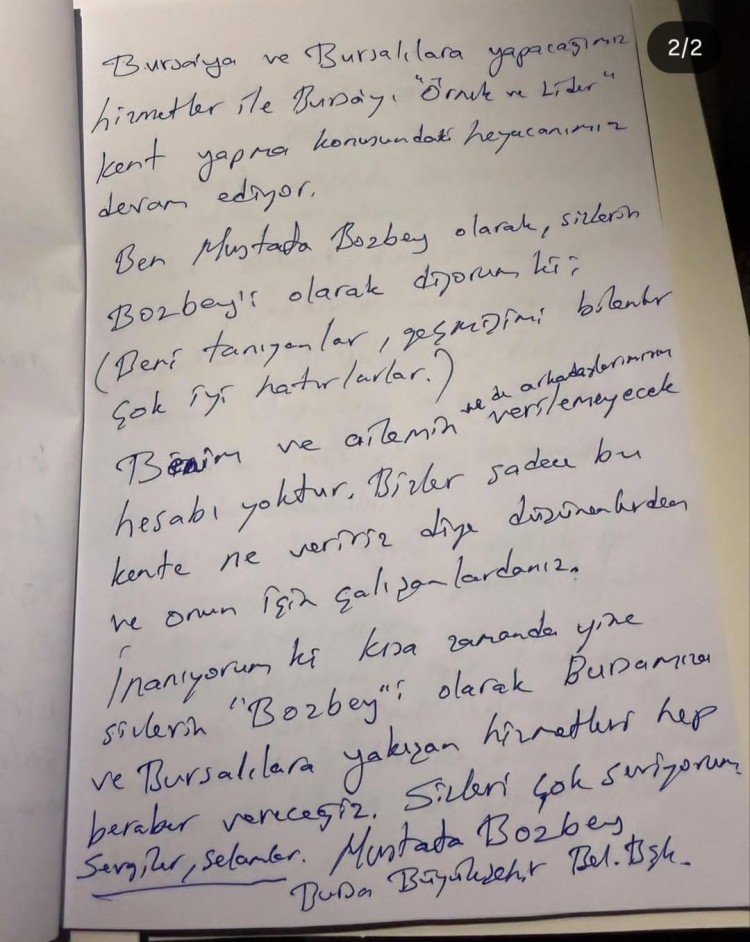 İnanıyorum ki kısa zamanda yine sizlerin "Bozbey"i olarak Bursamıza ve Bursalılara yakışan hizmetleri hep beraber vereceğiz. Sizleri çok seviyorum. Sevgiler, selamlar..."