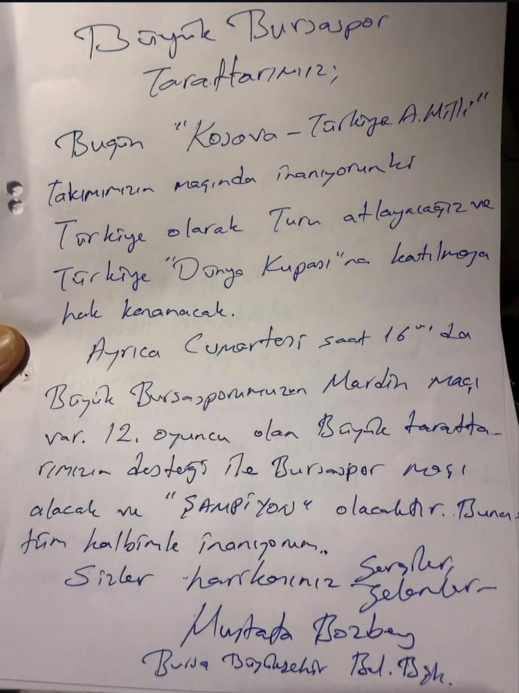 "Büyük Bursaspor Taraftarımız; Bugün "Κοsονα - Türkiye A Milli" takımımızın maçında inanıyorum ki Türkiye olarak turu atlayacağız ve Türkiye "Dünya Kupası"na katılmaya hak kazanacak.