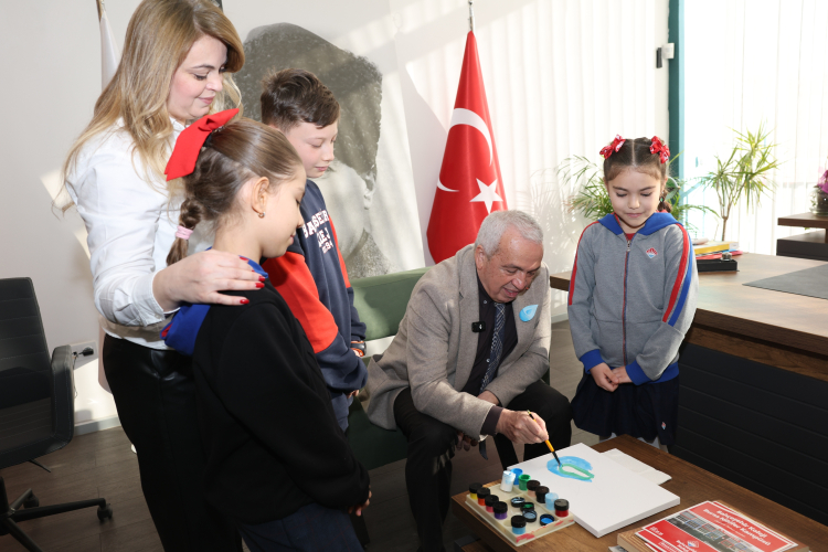 Ziyaretteki konulardan biri, küresel bir sorun haline gelen su kaynaklarının azalması ve kuraklık oldu. Öğrencilerin bu konuda yürüttüğü farkındalık çalışmalarını dinleyen Başkan Şadi Özdemir, projeye somut bir katkıda da bulundu. Yıl sonunda Bursa protokolünün ve mülki amirlerin çizimlerinin yer alacağı özel sergi için tuvalin başına geçen Başkan Şadi Özdemir, bir su damlası resmetti.