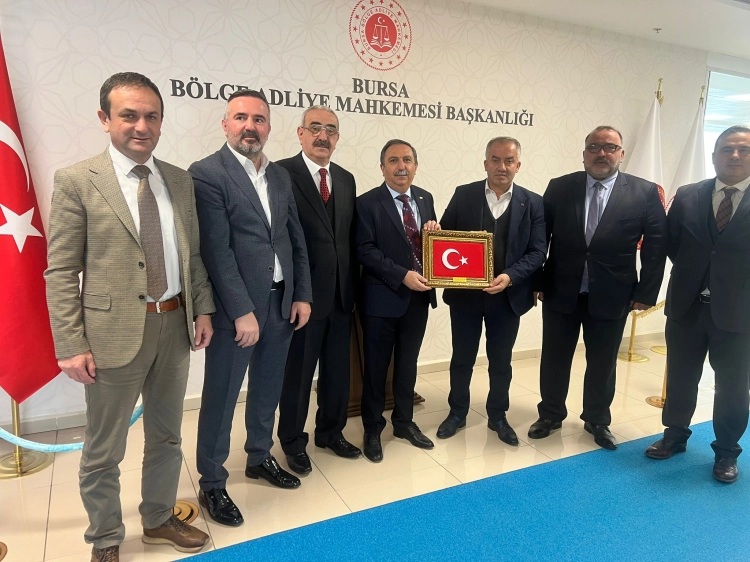 Akabinde heyet, Bursa Bölge Adliye Mahkemesi Başkanı Abdulkadir Şahin'i ziyaret ederek Türk Bayrağı tablosu hediye ettiler.