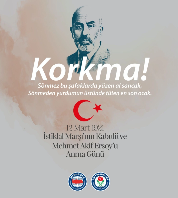 Memur Sen Bursa İl Temsilcisi, Eğitim Bir Sen Bursa 1 Nolu Şube Başkanı Ramazan Acar, İstiklal Marşı’nın kabulünün 104. yılı dolayısı ile açıklamalarda bulundu. Acar, “Dünyanın bütün birleşik emperyalistlerine karşı, imanla, hür ve onurlu yaşamak için insanüstü bir dayanma ve direnişle verdiğimiz İstiklâl Harbi esnasında bu aziz milletin hayat, varlık, medeniyet ve istiklal anlayışını, kendi benlik ve kimliğini bütün dünyaya haykırarak ilan ettiği, gerçek bir varoluş deklarasyonu olan İstiklâl Marşının 12 Mart 1921’de TBMM’de milli marş olarak kabul edilmesinin 104. yılını aynı ruh ve bilinçle idrak etmenin heyecanı içindeyiz.” ifadelerini kullandı.