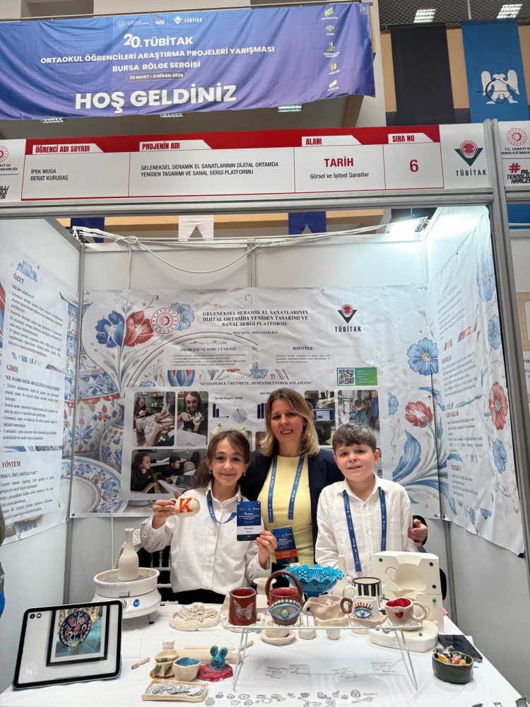 Türkiye genelinde 19 bin 437 proje arasından 3 projesiyle Bursa Bölge Finalleri’nde ilk 100’e giren Ekol Koleji, “Geleneksel Seramik El Sanatlarının Dijital Ortamda Yeniden Tasarımı ve Sanal Sergi Platformu” projesiyle Bölge 3.’lüğü elde etti.