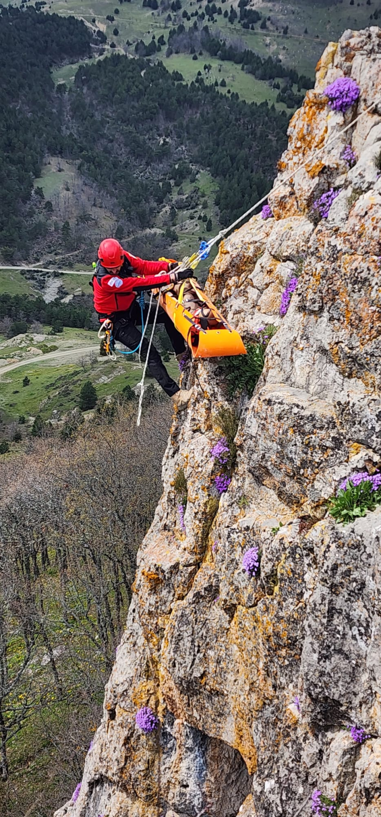 Zorlu arazi şartlarında gerçekleştirilen tatbikatta, kayalık alanda mahsur kaldığı senaryolaştırılan yaralı kısa sürede tespit edilerek ekiplerin koordineli çalışmasıyla bulunduğu noktadan güvenli şekilde kurtarıldı.
