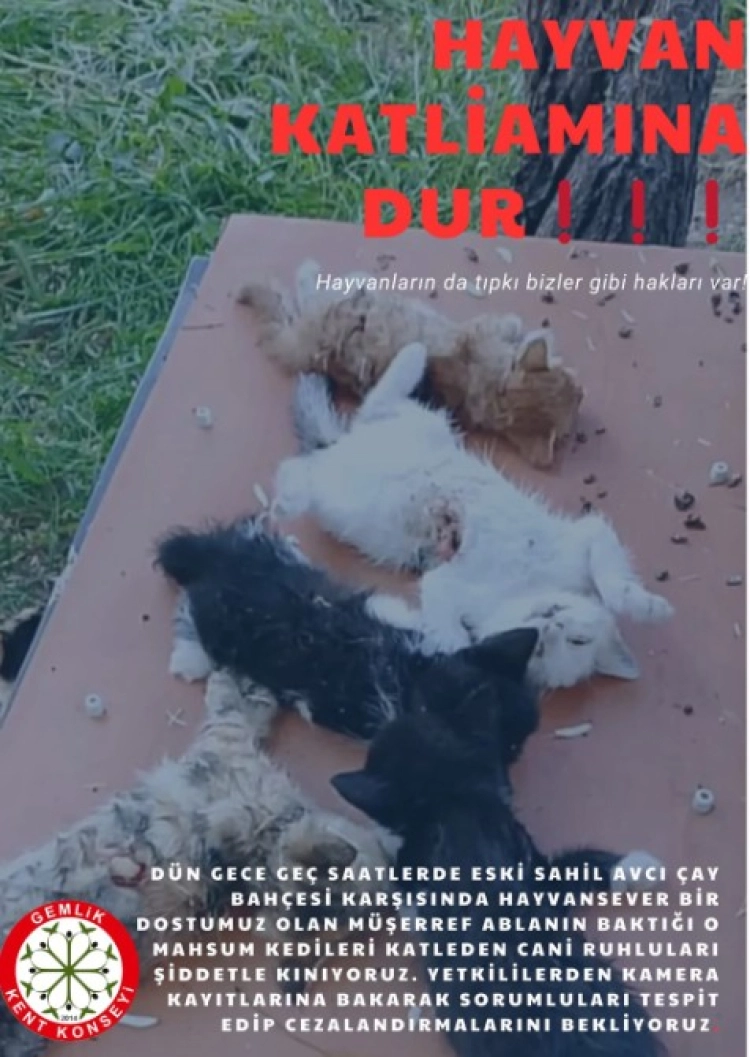 Gemlik’te hayvanseverler tarafından beslenen yavru kediler, kimliği belirsiz kişilerce canice öldürüldü. Gemlik Kent Konseyi paylaşımında ‘hayvan katliamına dur de’ diyerek menfur olaya tepki gösterdi.