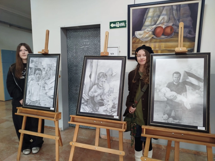 Bursa Zeki Müren Güzel Sanatlar Lisesi öğrencileri Filistinli çocukların yaşadığı acıları sanatsal ifade biçimleriyle sergileyerek savaşın yıkıcı etkilerine dikkat çekti.