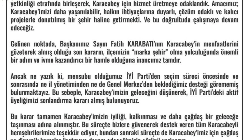 Karacabey Belediyesi İYİ Parti meclis üyeleri Hilmi Kuru, Süleyman Yörür, İlyas Aksoy ve Ahmet Karakuş, istifa kararının Karacabey Belediye Başkanı Fatih Karabatı'nın "marka şehir" vizyonuna destek olmak ve ilçenin menfaatlerini korumak amacıyla alındığını belirtti.