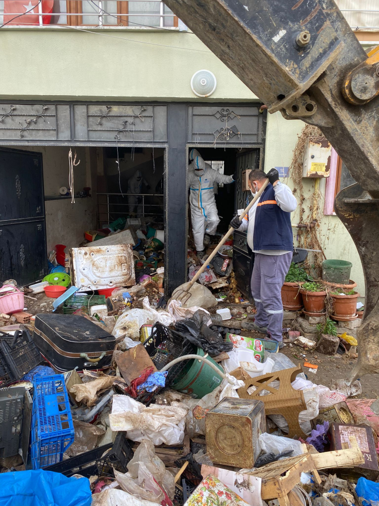 Evin tamamen boşaltılmasının ardından, biriken çöplerin neden olduğu bakteri, haşere ve kötü koku oluşumunu engellemek amacıyla binanın içi ve çevresi detaylı bir şekilde ilaçlanarak dezenfekte edildi.