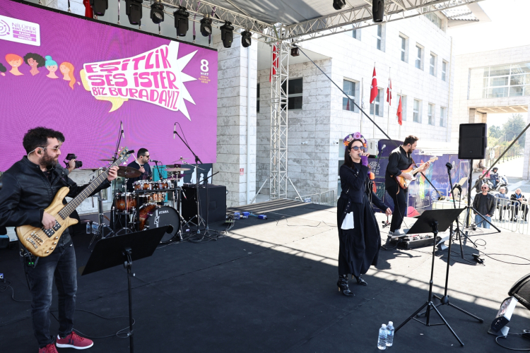 Nilüfer Belediyesi ve Nilüfer Kent Konseyi öncülüğünde düzenlenen 8 Mart yürüyüşünde kadınlar “Eşitlik Ses İster, Biz Buradayız” sloganıyla Cumhuriyet Meydanı’na yürüdü. Etkinlikte yapılan basın açıklamasında kadın hakları ve eşitlik vurgusu yapıldı.