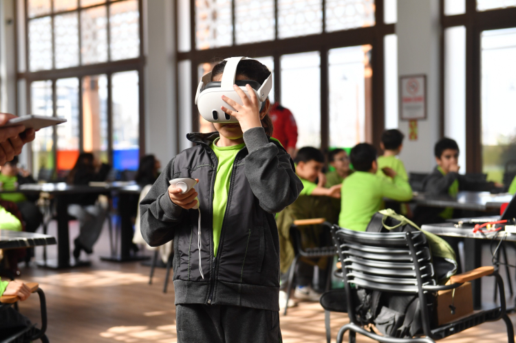 İsmail Hakkı Tonguç Kütüphanesi’nde gerçekleştirilen eğitimde öğrenciler, deprem ve diğer afetlere karşı doğru davranışları öğrenirken, VR gözlüklerle senaryoları deneyimleme fırsatı buldu.