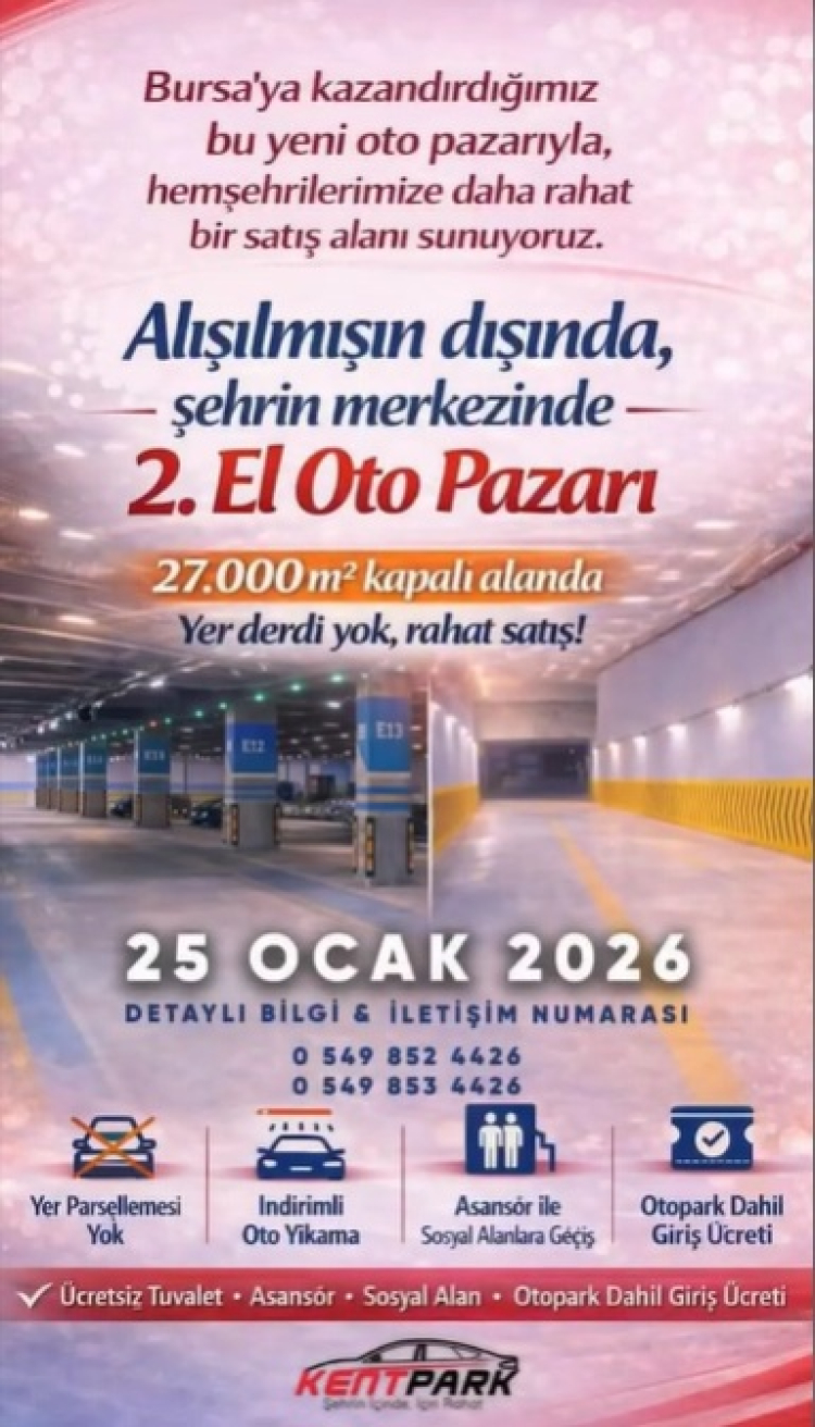 Osmangazi’de, Almira Hotel karşısında bulunan Kent Meydanı’nın altındaki KentPark Otopark’ta kurulan oto pazarı, toplam 27 bin metrekarelik geniş bir alanda hizmet veriyor. Kapalı yapısı sayesinde yağmur ve çamurdan etkilenmeden araçların sergilenebileceği pazarda, vatandaşlar rahat bir ortamda alım-satım yapabiliyor.