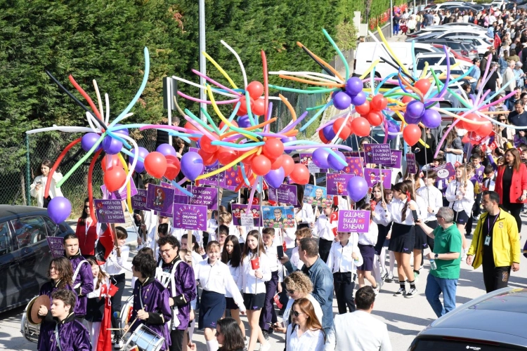 Ulu Önder Mustafa Kemal Atatürk’ün dünya çocuklarına armağan ettiği 23 Nisan Ulusal Egemenlik ve Çocuk Bayramı dolayısıyla Şahinkayalı öğrenciler görkemli bir tören gerçekleştirdiler. Merkez kampüsten başlayan kortejde ellerinde Türk bayraklarıyla mutluluk içinde yürüyen öğrenciler caddeleri marşlarla inlettiler. Kortejin başını çeken Academy Bando Takımının dikkat çeken performansına eşlik eden öğrencilere semt sakinleri de balkonlardan ve dükkanlardan katılarak coşkuya ortak oldular.