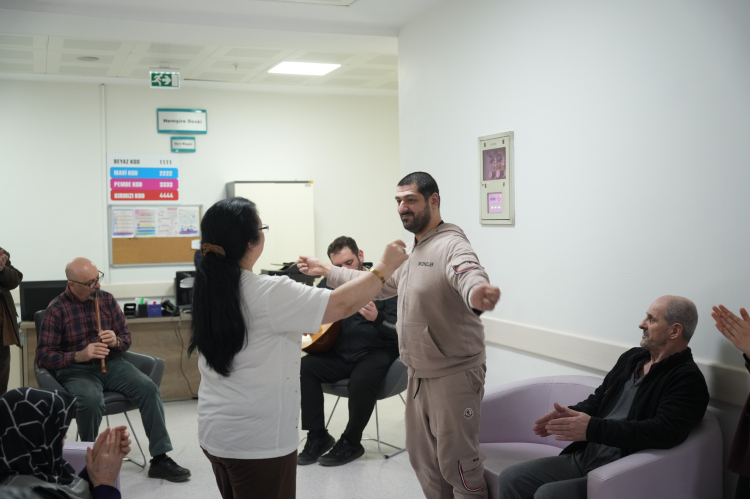 Yenişehir Belediyesi Türk Halk Müziği Korosu Şefi Kemal Kamalı, bağlama eğitmeni Selçuk Oruç ve ney eğitmeni Veli Kenan Şimşek’in sahne aldığı programda, Türk müziğinin en seçkin eserleri seslendirildi. Neyin huzur veren tınısı ve bağlamanın içten melodileriyle buluşan hastalar, tedavi süreçlerine kısa bir müzik molası verdi.