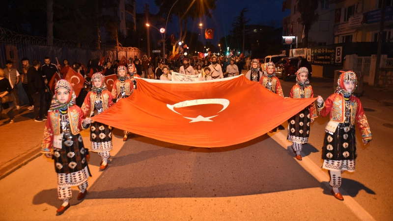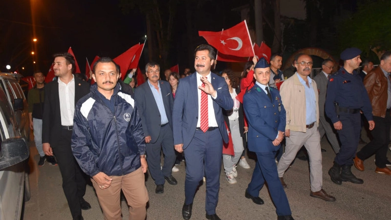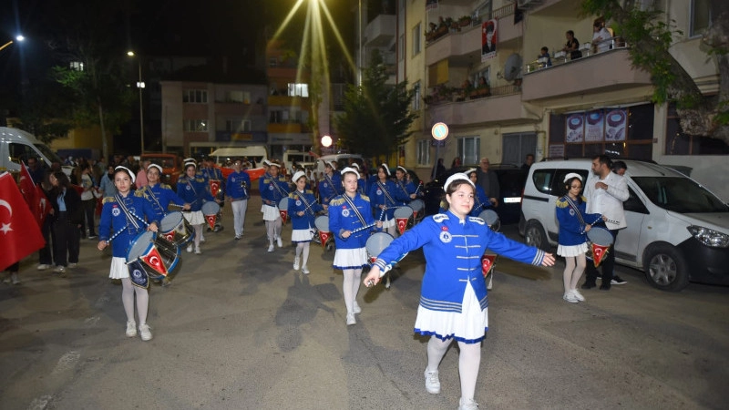 Yenişehir’de kutlamalar gün boyu devam ederken gece saatlerinde ise coşku arttı. Fincan Kafe’nin önünden Millet Bahçesi’ne kadar bando eşliğinde kortejle yürüyüş gerçekleştirildi. Yürüyüşe, ilçe protokolünün yanı sıra binlerce Yenişehirli de katıldı. Millet Bahçesi’nde kurulan sahnede ilk olarak Yenişehir Belediyesi Halk Oyunları ekibi sahne aldı. Gecede coşku Mavi Düş Grubu’nun konseriyle tavan yaptı.