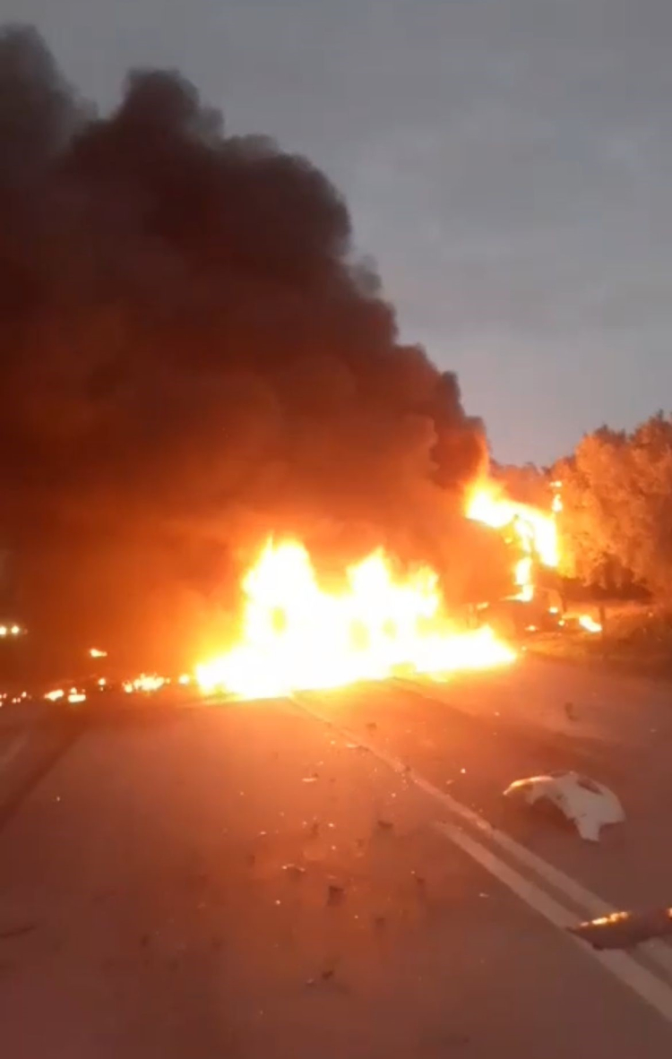 Bursa'nın İznik ilçesinde tanker ile karşı şeritten gelen otomobil kafa kafaya çarpıştı. Çapmanın etkisiyle alev alan tank patladı. Savaş alanını andıran kaza görüntüleri kameralara yansıdı.