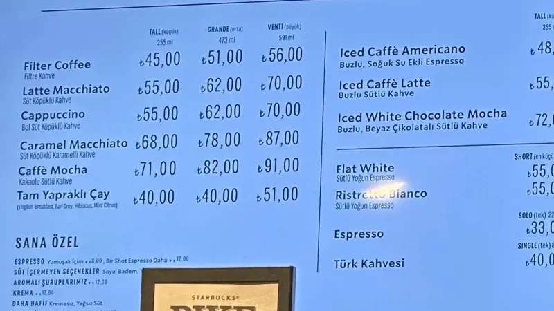 Şaşırtıcı olan ise Karamel frappucino kahvenin orta boyutunun fiyatı zam öncesi 74 lirayken zam sonrası küçük boy fiyatı 90 lira olması oldu.