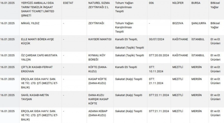 Ülkenin dört bir yanında, mandıradan, kasabına, kebapçısına, paketli gıdaya kadar gıda ürünlerinde vatandaşın sağlığını riske düşüren markaları Bakanlık kamuoyuna yayımladığı liste ile duyurdu. Özellikle zeytinyağında ve kırmızı ette taklit ve tağşiş karıştığı gözlemlendi.
