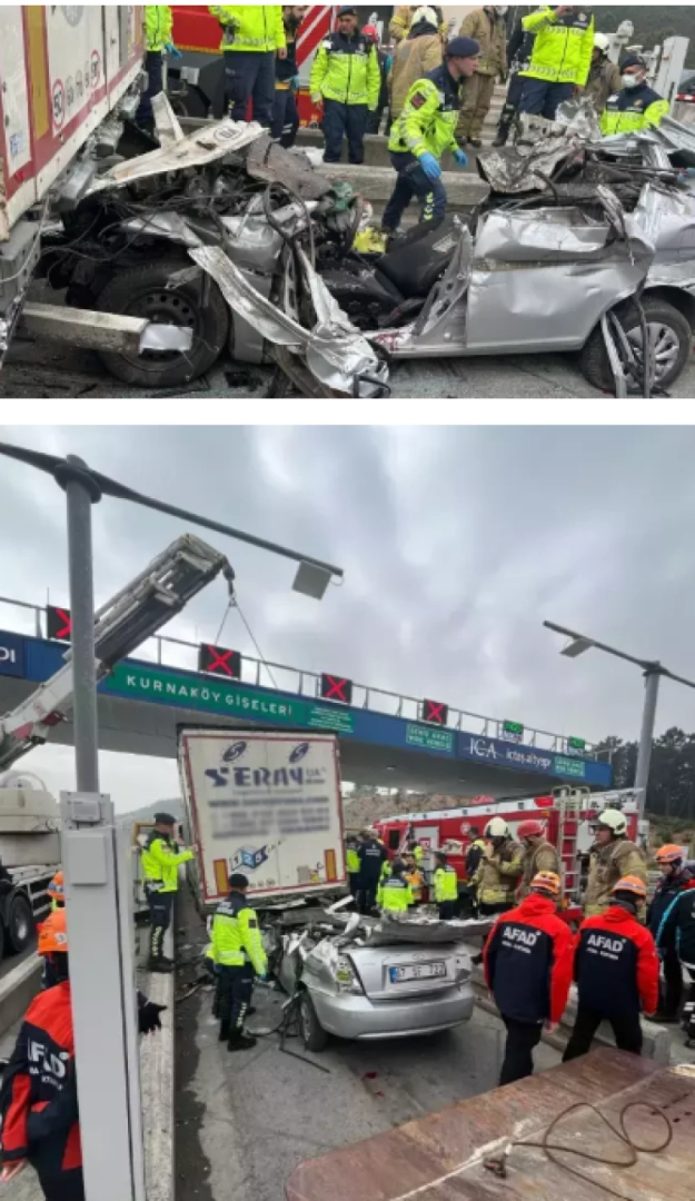 Kaza, saat 10.00 sıralarında Kuzey Marmara Otoyolu Kurnaköy gişeleri Ankara istikametinde meydana geldi. Gişelerden geçen tırın arkasından gelen otomobil, henüz bilinmeyen bir nedenle tırın altına girdi. Çevredeki sürücülerin ihbarı üzerine olay yerine polis, itfaiye ve sağlık ekipleri sevk edildi.