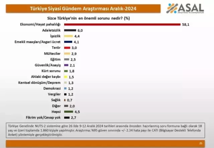 Asal Araştırma'nın katılımcılara, "Türkiye'nin en önemli sorunu nedir?" ve "Türkiye'nin sorunlarını hangi siyasi parti çözebilir?" sorusunu yönelttiği yılın son anketinden çarpıcı sonuçlar çıktı.