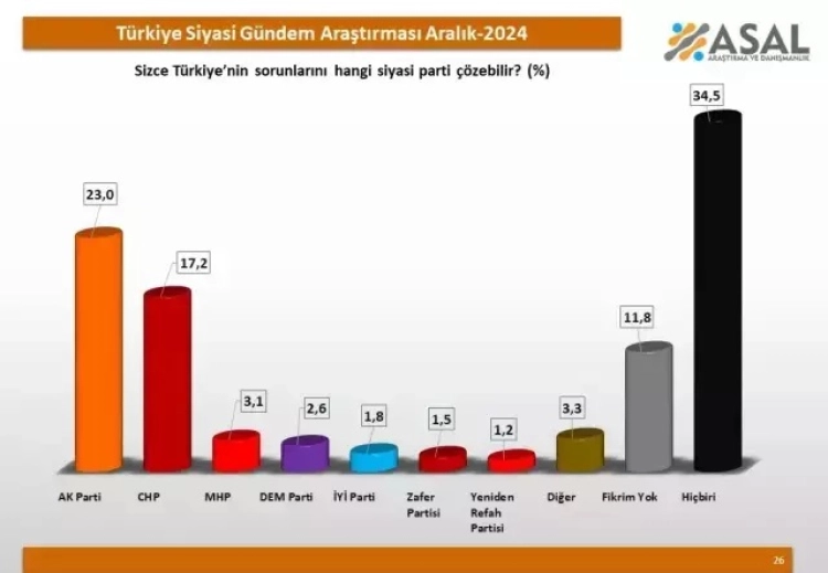 Asal Araştırma'nın yılın son ayında gerçekleştirdiği anketten çarpıcı sonuçlar çıktı. Araştırma şirketi, 9-12 Aralık tarihleri arasında 26 ilde bin 860 katılımcıya, Türkiye'nin ekonomi, eğitim, hukuk ve sağlık sistemiyle ilgili sorunlarını hangi partinin çözebileceğini sordu. Halkın umutsuzluğu anket sonuçlarına yansıdı.